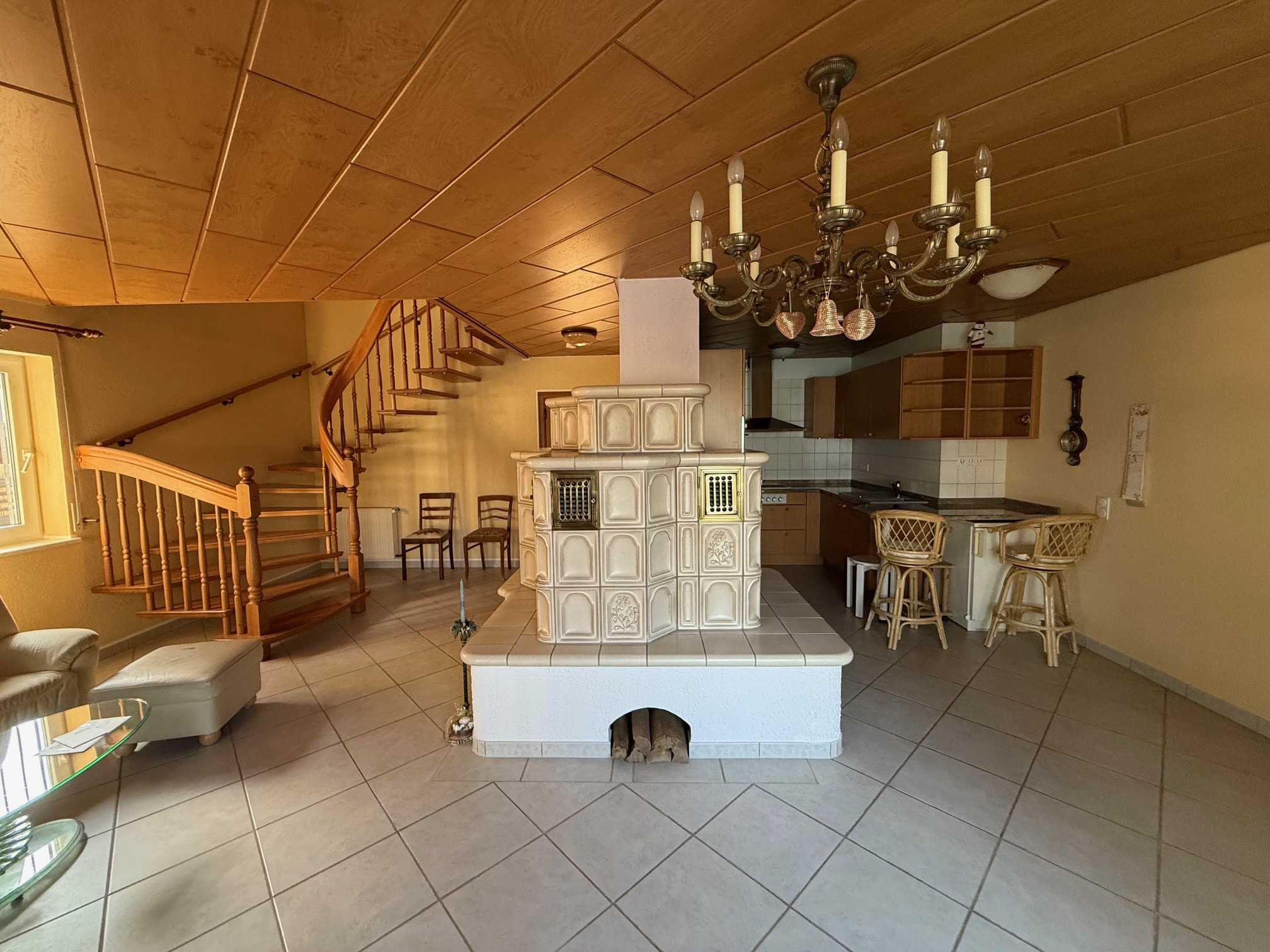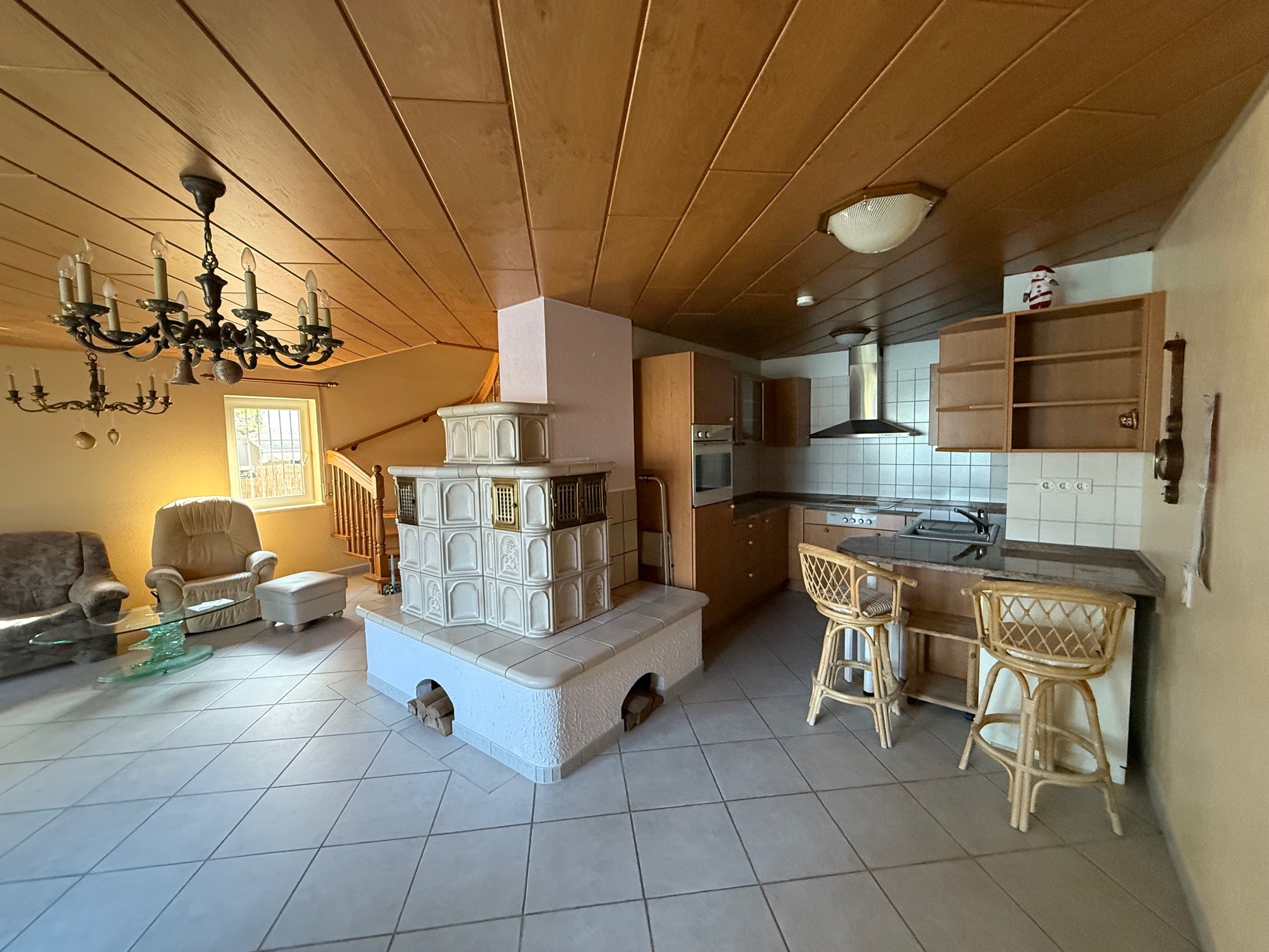 Das Haus befindet sich in einem sehr guten Pflegezustand. Der sich über die gesamte Terrasse erstreckende Wintergarten wurde erst im Jahr 2011 angebaut. Im Jahr 2024 folgte die Installation einer PV-Anlage mit entsprechender Wallbox. Der Eingangsbereich wie auch das gesamte Treppenhaus incl. dem Gäste-WC sind mit einem Fliesenboden ausgestattet. Im Gäste-WC besteht die Möglichkeit durch bereits vorhandene Anschlüsse leicht eine Dusche zu installieren oder den Stellplatz von Waschmaschine und Trockner hierher zu verlegen. Vom Flur gehen das Gäste-WC und das Arbeitszimmer (derzeit mit einer Rotlichtkabine ausgestattet) ab. Im großzügigen Wohnzimmer liegt der Aufgang zum Obergeschoss sowie die offene Küche. Ein Kachelofen ist hier ebenfalls vorhanden und sorgt im Winter für wohlige Wärme. Der kleine Flurbereich im Dachgeschoss ist mit einem Vinylboden versehen. Die beiden Schlafzimmer verfügen über einen Korkboden (dieser ist allerdings erneuerungsbedürftig). Das Badezimmer im DG verfügt über eine Badewanne, zwei Waschbecken und eine Dusche. Alle Räume des Hauses verfügen über Fenster und Außenrollos. Im Untergeschoss des Hauses befinden sich die Waschküche, ein großer Kellerraum sowie der Heizungsraum mit den Öltanks. Die genaue Aufteilung des Hauses entnehmen Sie bitte den beigefügten Grundrissen (Keller abweichend).